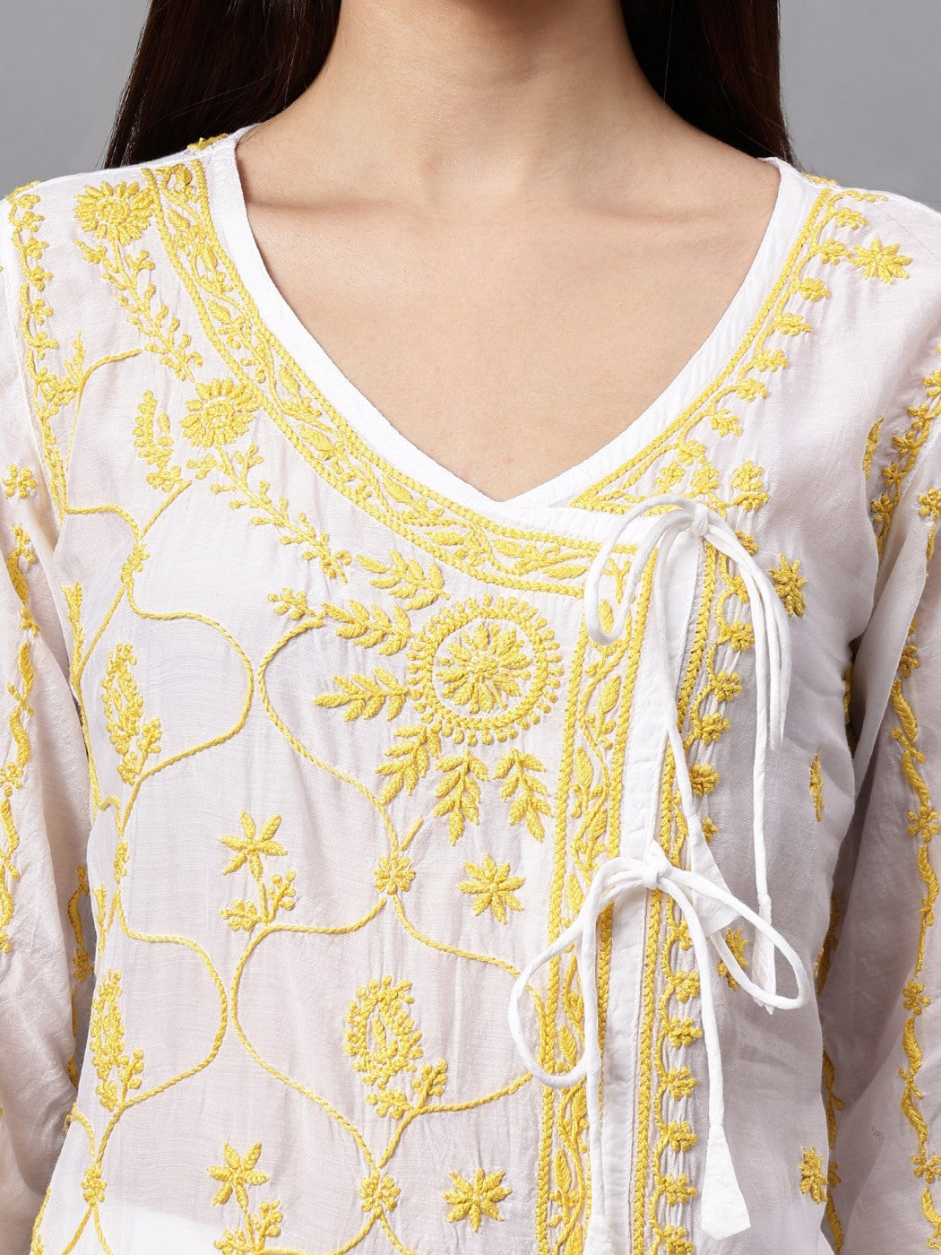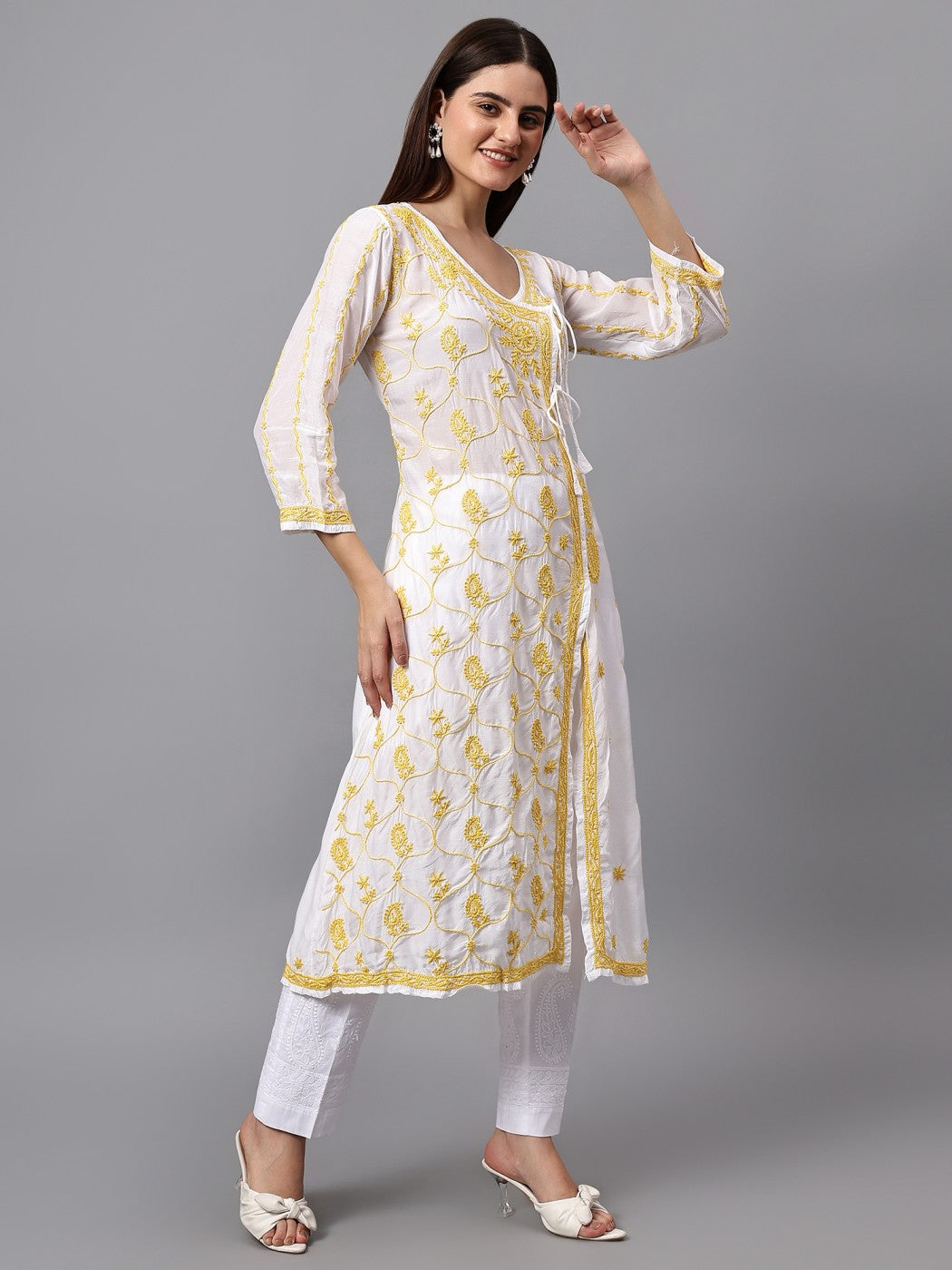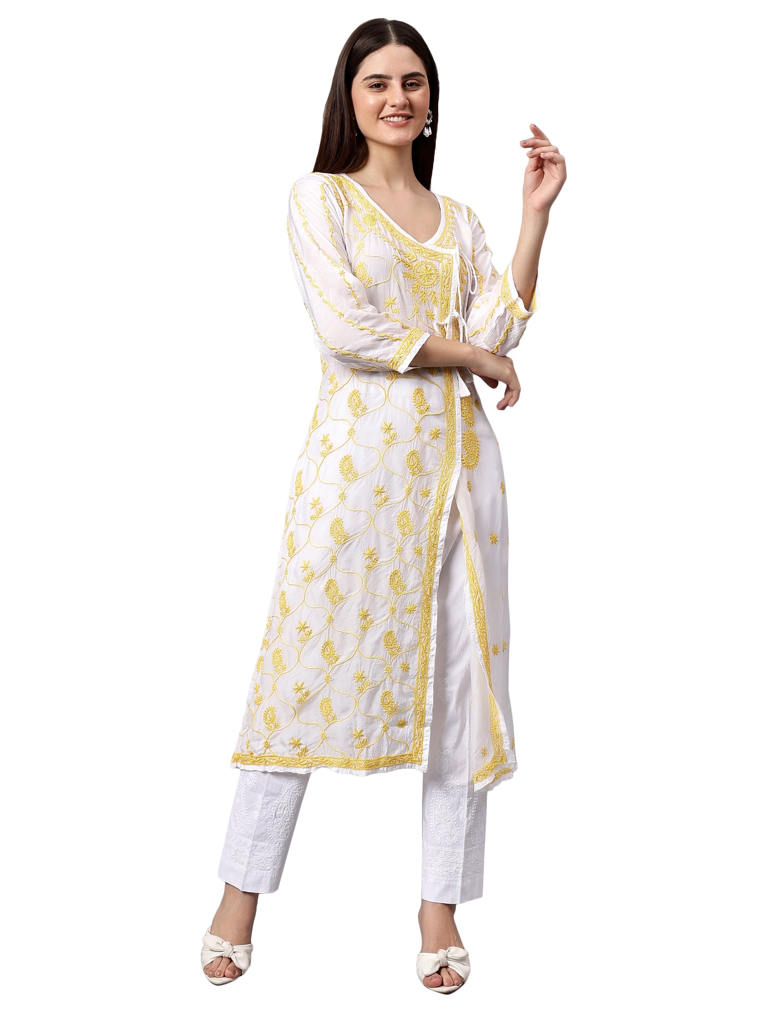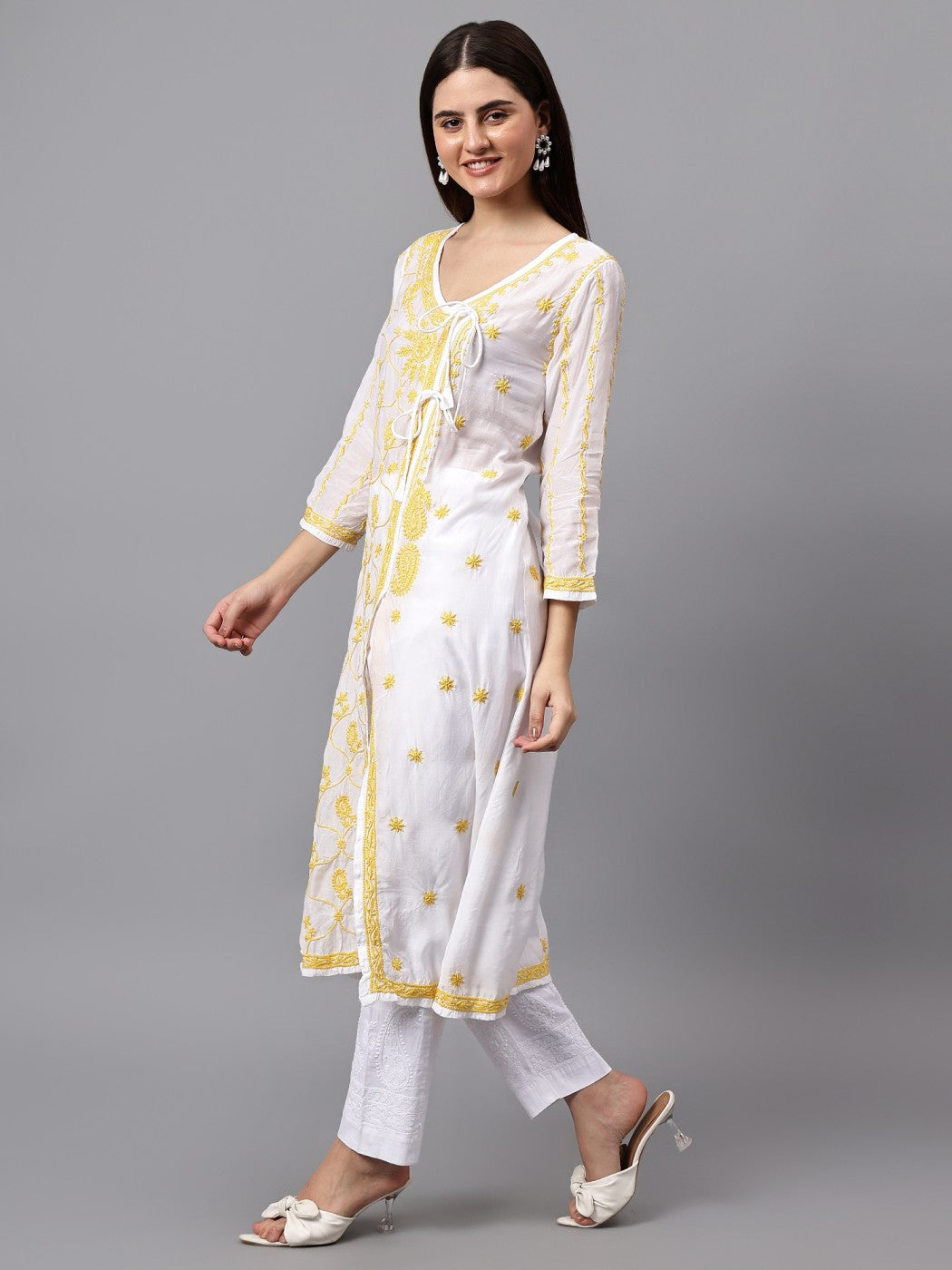 DESIGN: Traditional Angrakha style Kurta crafted with premium muslin fabric featuring intricate Lucknowi Chikankari embroidery work.