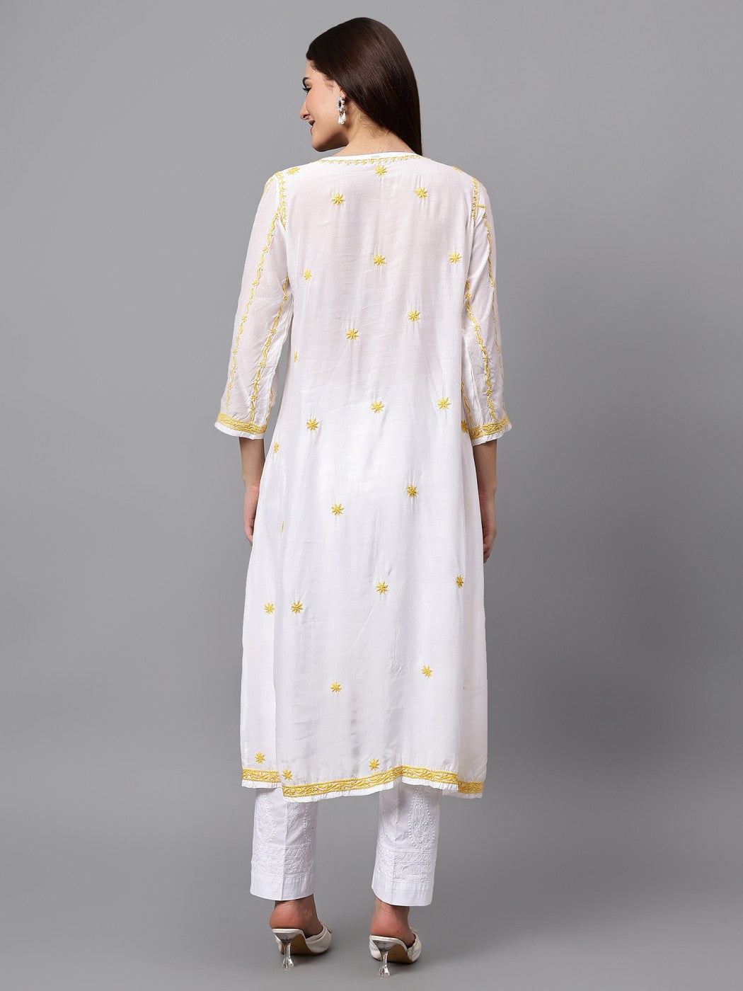 CRAFTSMANSHIP: Handcrafted Chikankari embroidery showcasing delicate threadwork and traditional motifs throughout the garment.