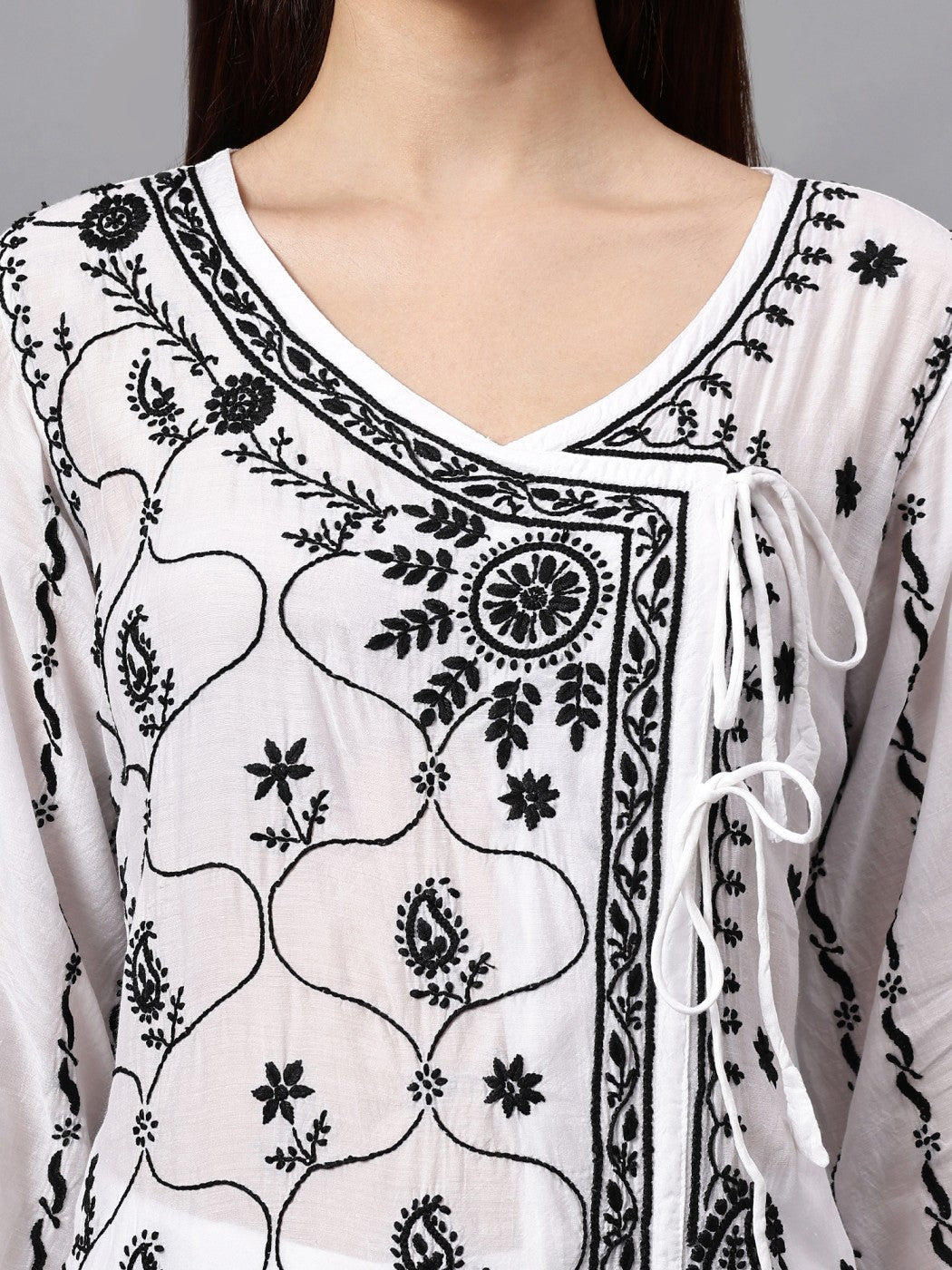 DESIGN: Traditional Angrakha style Kurta crafted with premium muslin fabric featuring intricate Lucknowi Chikankari embroidery work.
