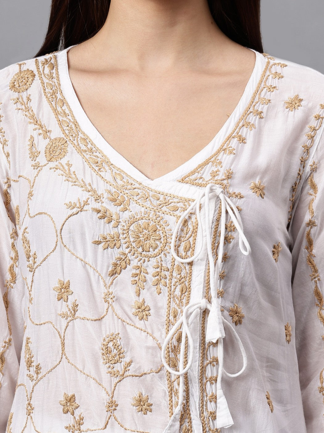 Discover timeless elegance with this exquisite Lucknowi Chikankari Angrakha Kurta crafted from premium muslin fabric. The traditional Angrakha style features the renowned Chikankari embroidery, a centuries-old art form from Lucknow that adds a touch of sophistication to this feminine silhouette. The lightweight muslin fabric ensures comfort and graceful draping, making it perfect for both casual and festive occasions. This versatile kurta can be paired with palazzo pants, churidars, or straight pants to create different looks. The delicate handcrafted embroidery showcases intricate patterns that exemplify the finest of Indian craftsmanship. Suitable for warm weather, this kurta combines classic design elements with contemporary styling. The comfortable fit and breathable fabric make it an ideal choice for various occasions. Hand wash recommended to preserve the beauty of the embroidery.