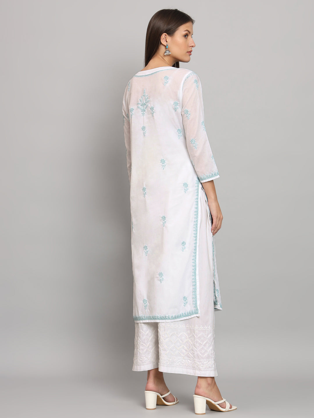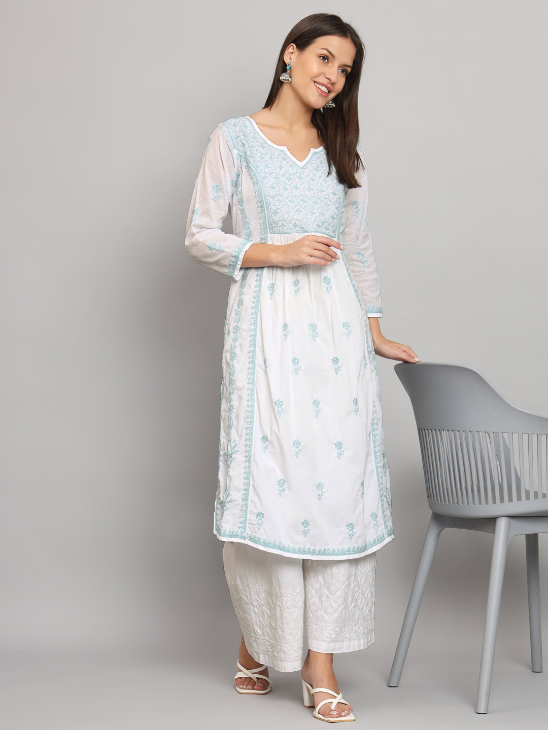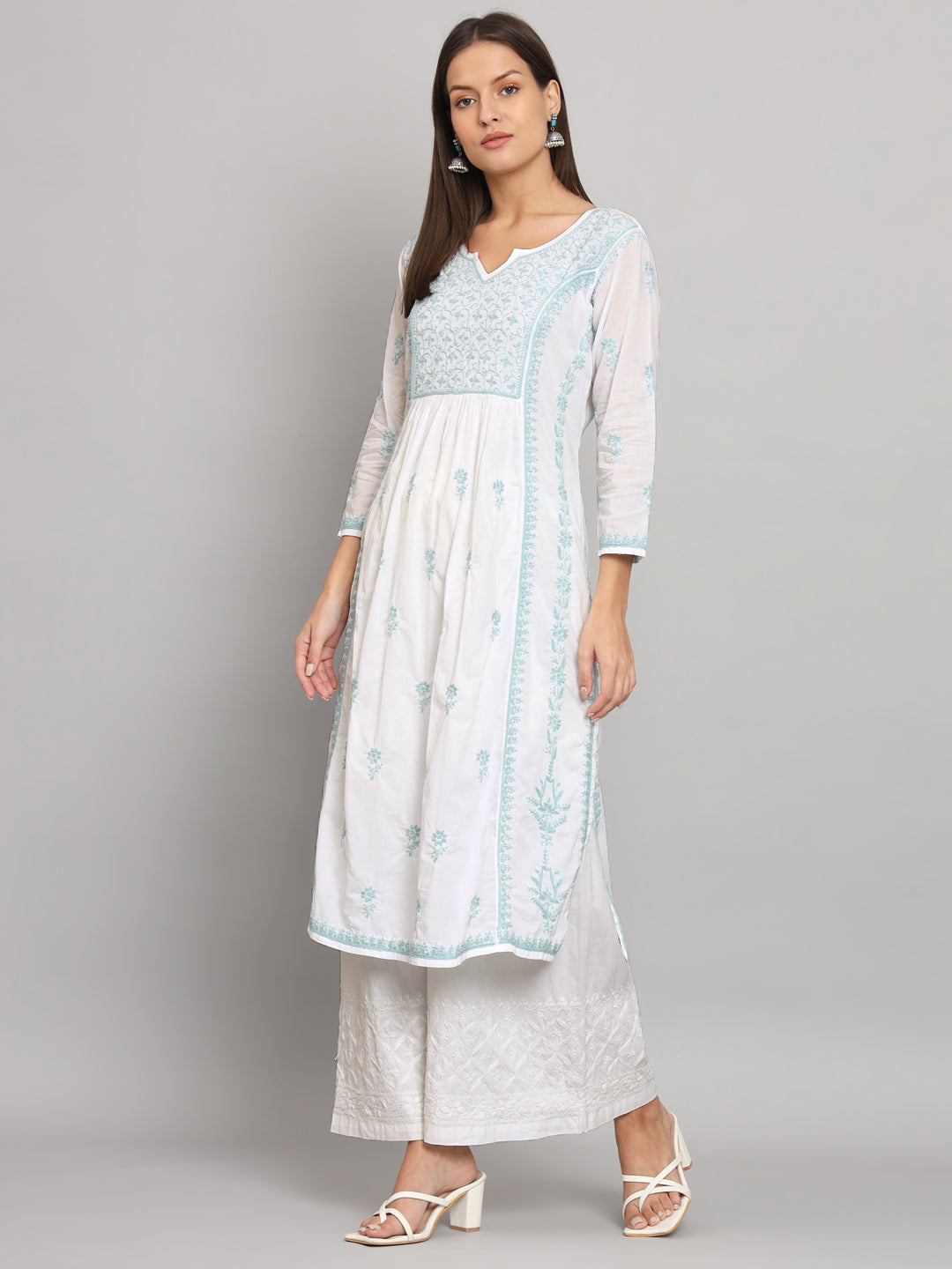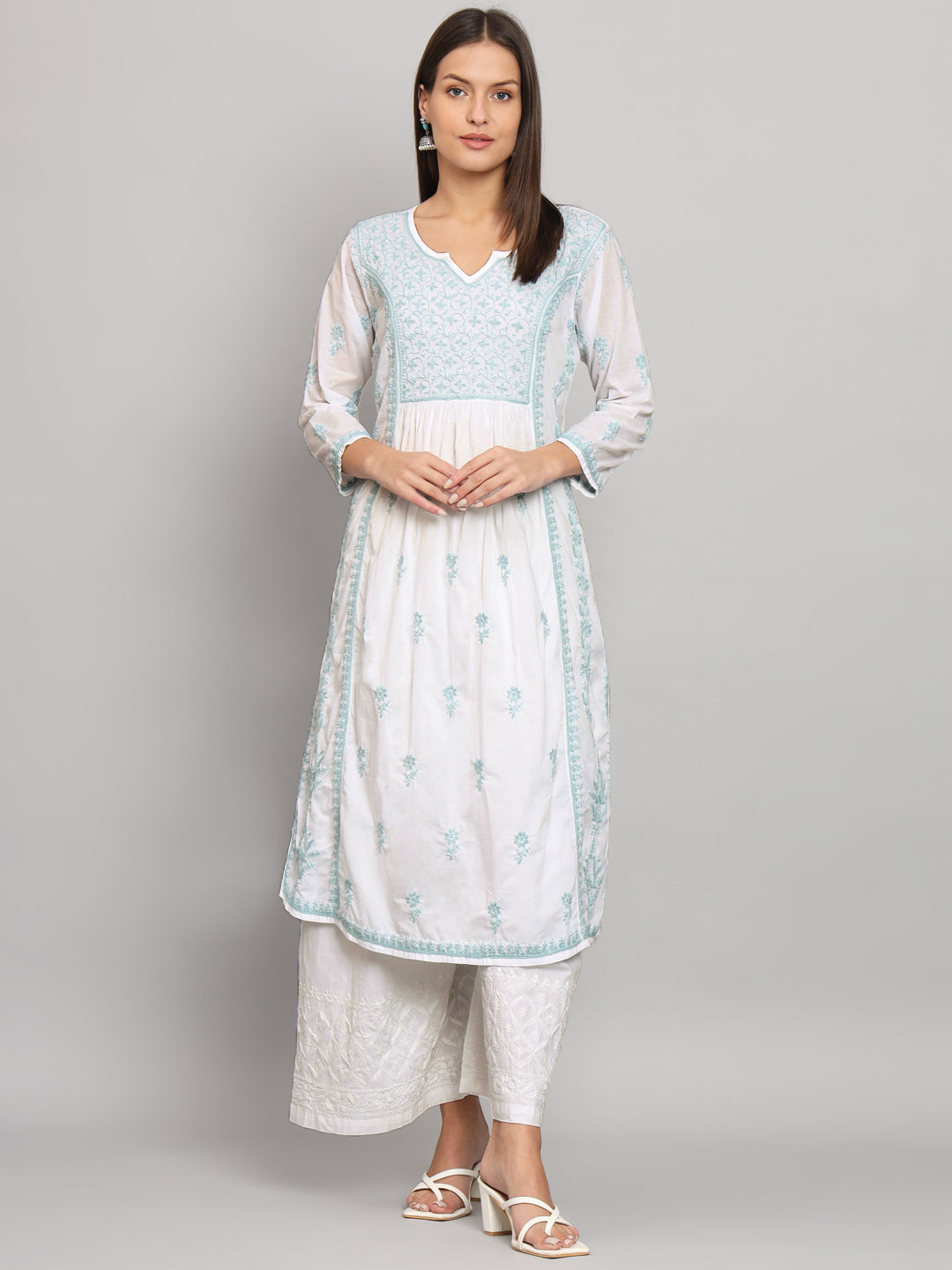 Lucknowi Nyra cut Chikankari kurti with fine fanda murri work| uses coloured thread over white camric cotton fabric| craft Lucknowi chikankari