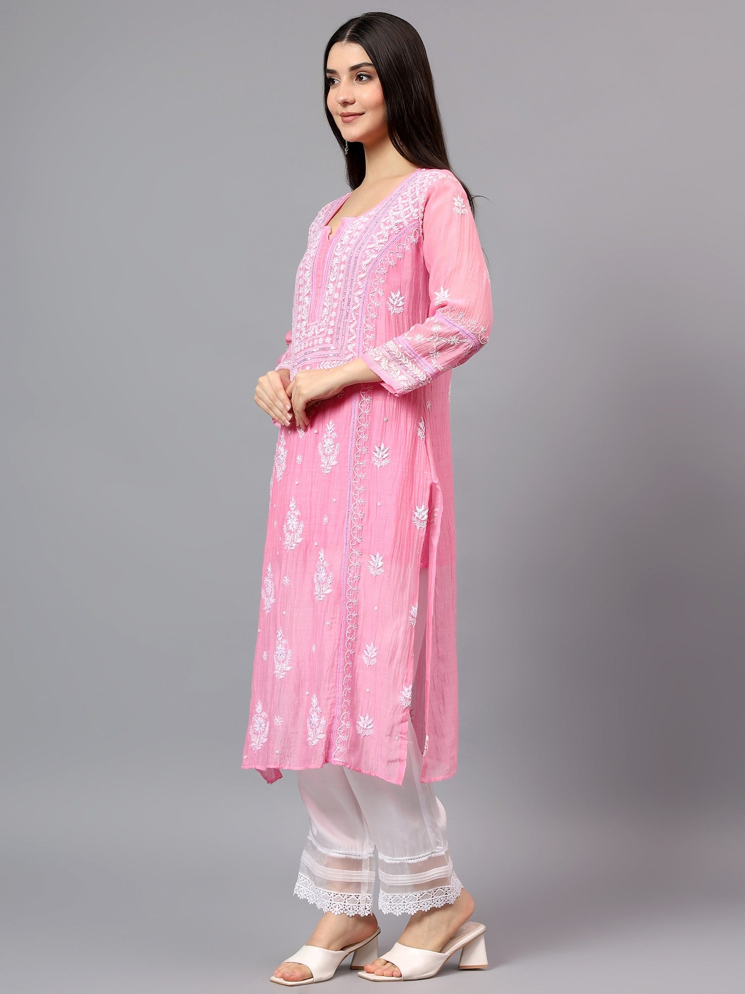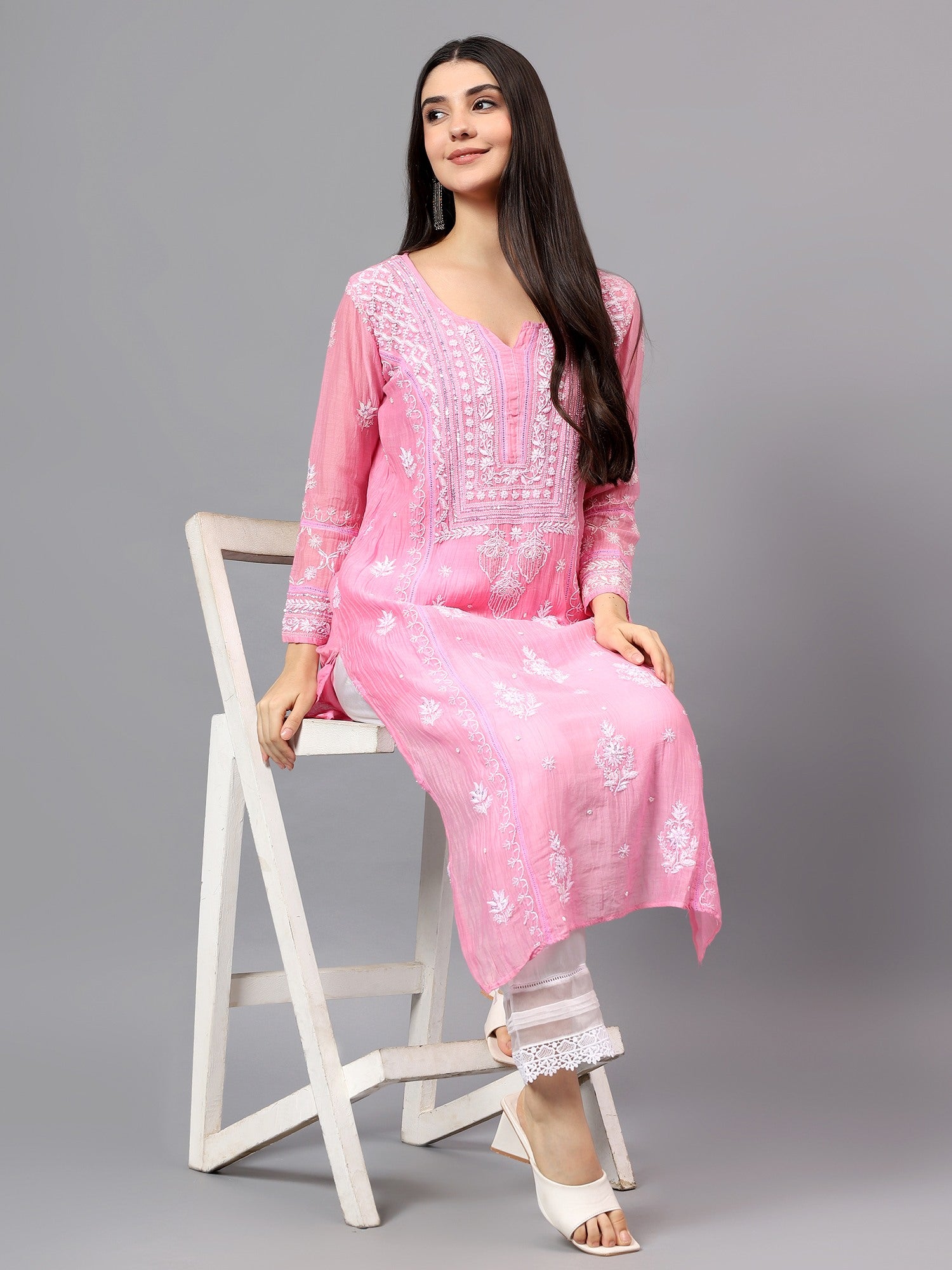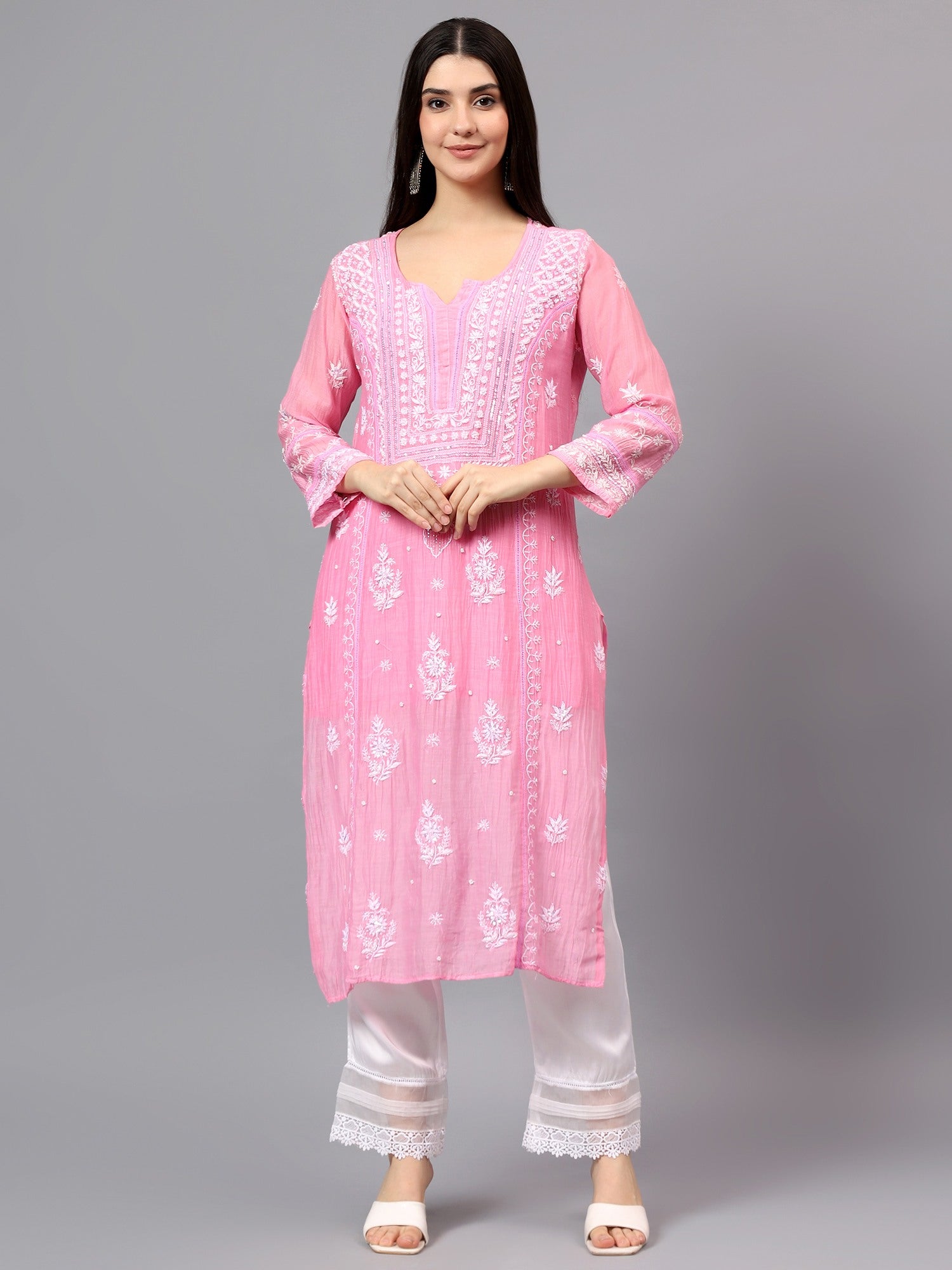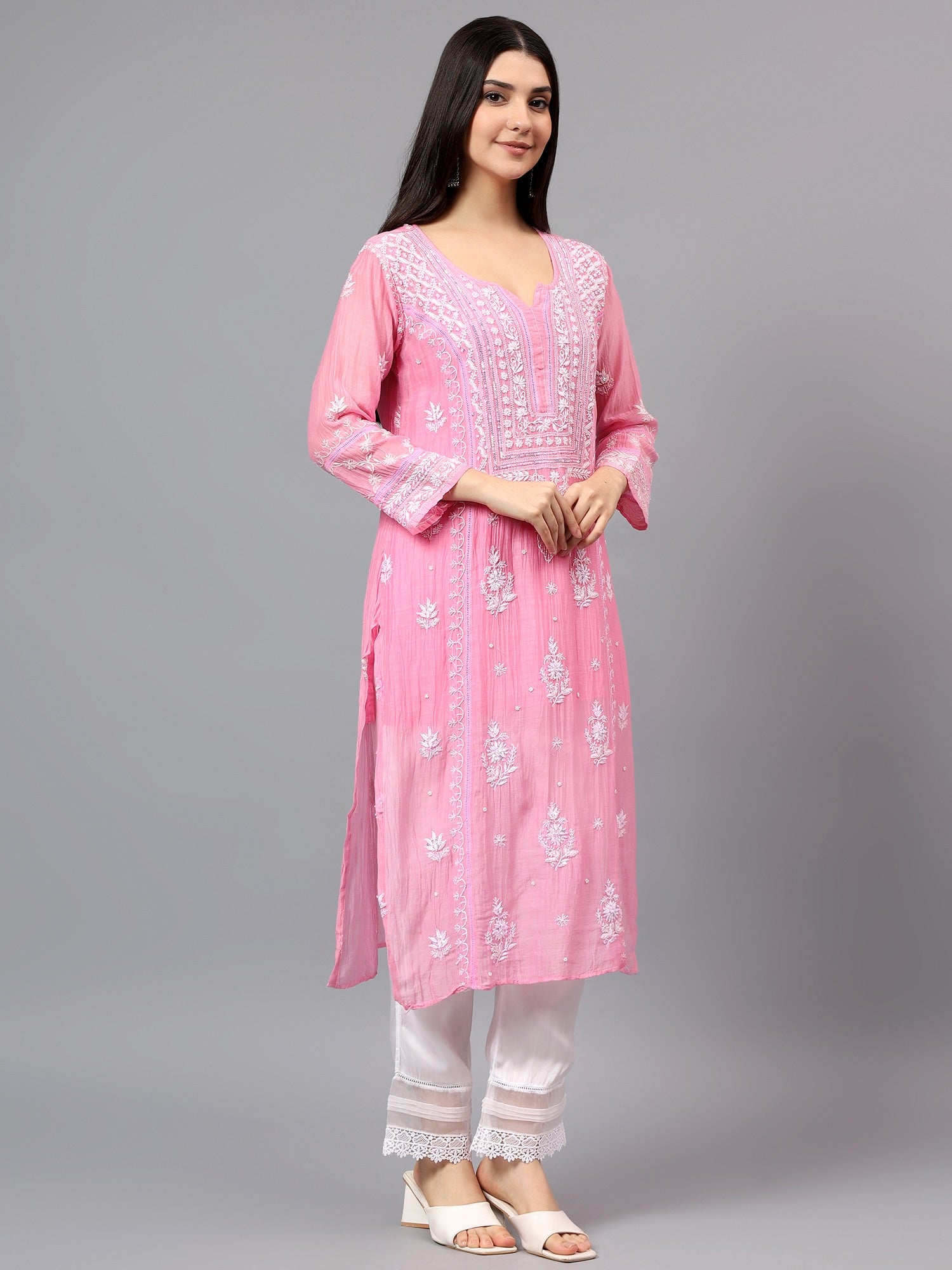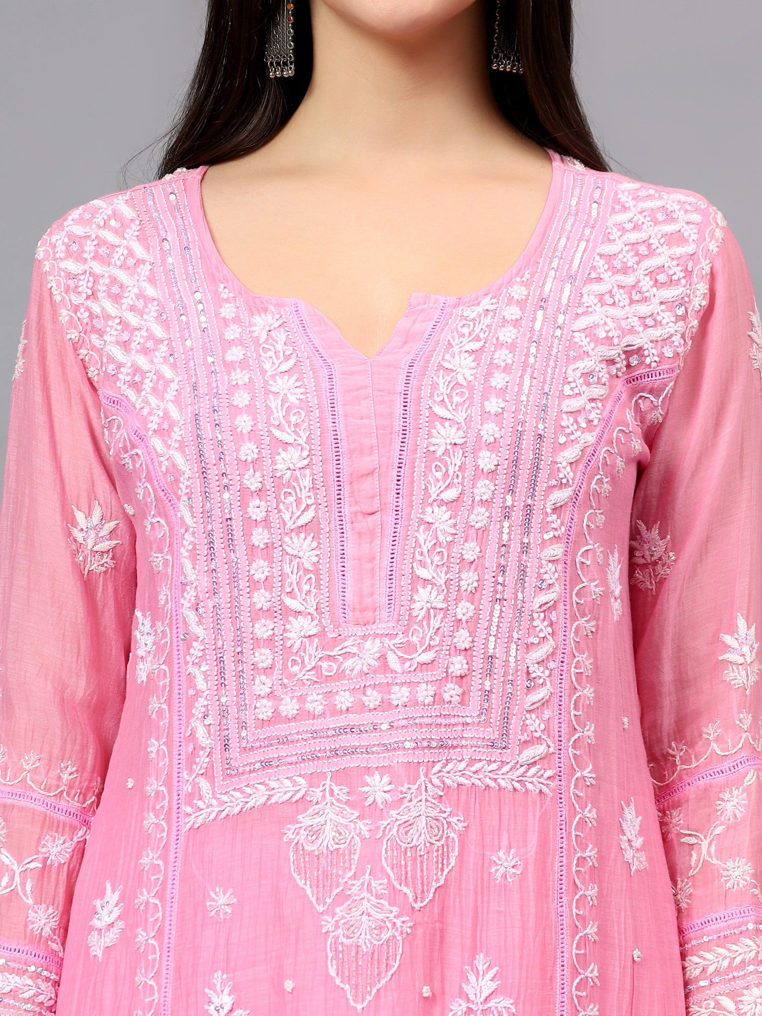 Crafted from pure Mal Chanderi fabric, this kurta showcases exquisite Lucknowi chikankari embroidery paired with intricate zari dardozi embellishments. The lightweight, breathable material ensures comfort while the detailed handcrafted designs add a timeless elegance, making it perfect for festive occasions and formal gatherings. This kurta exemplifies traditional artistry with a sophisticated finish, ideal for those who appreciate fine craftsmanship and classic Indian textiles.